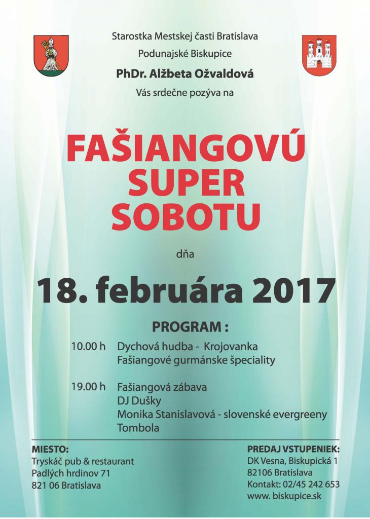 Tradičné fašiangové podujatie v Podunajských Biskupiciach prilákalo 18. februára do športového areálu Tryskáč stovky Biskupičanov i návštevníkov. Starostka mestskej časti Alžbeta Ožvaldová pozvala všetkých Biskupičanov na zabíjačkovú kapustnicu a chutné fašiangové šišky s lekvárom. V ponuke boli tiež tradičné zabíjačkové špeciality – oškvarky, krvavničky a jaterničky, slaninka či čerstvo vytopená masť. Prvá časť programu patrila ľudovej hudbe Krojovanka. Kapela spestrila vystúpenie aj humorne ladeným pochovávaním basy. Večerná Oldies Party pokračovala v uvoľnenom duchu fašiangového obdobia zábavy a radosti. Viac ako 150 hostí si zatancovalo na hity našej mladosti, ktoré na želanie mixoval DJ Dušky až do skorého rána. Príjemným prekvapením bolo aj spevácke vystúpenie a evergreeny v podaní Moniky Stanislavovej, známej z mnohých hudobných televíznych programov. Hostia si okrem pretancovaných topánok odnášali aj hodnotné tombolové ceny a veríme, že aj nezabudnuteľné zážitky. Pred prichádzajúcim pôstnym obdobím je dobré nájsť si okrem práce čas aj na relax a zábavu. Vďaka patrí organizátorom Fašiangovej super soboty, že nám to umožnila.