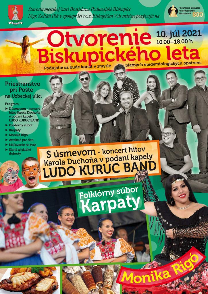 leto nám už zaklopalo na dvere tak ho poďme spolu privítať 10.7.2021 na priestranstve na Uzbeckej ulici pri Pošte. Bude vás čakať hudobný program v podobe Ľudo Kuruc band, folklórny súbor Karpaty a Monika Rigó. Pre deti budú pripravené rôzne detské atrakcie, maľovanie na tvár a samozrejme dobré jedlo, pri ktorom si túto dobrú atmosféru môžete vychutnať. Tešíme sa na vás priatelia