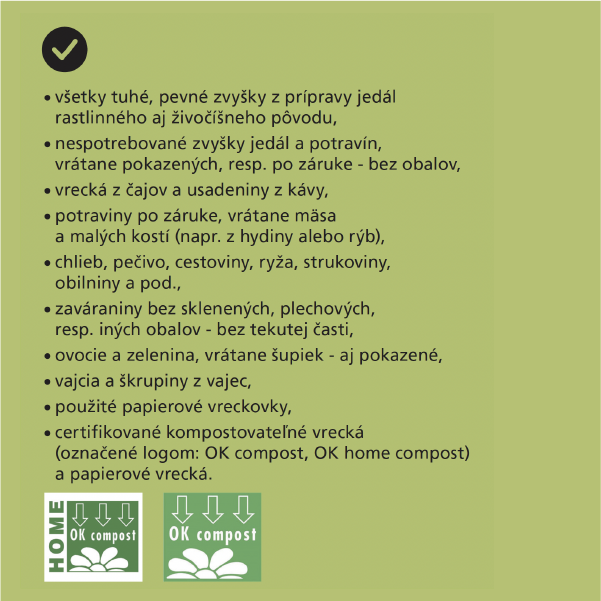 Používajte len zberné nádoby doručené spoločnosťou OLO a.s. a certifikované kompostovateľné vrecká, ktoré ste dostali na 12 mesiacov v počte 150 ks (2 až 3 vrecká na týždeň). Ak dodané kompostovateľné vrecká spotrebujete, môžete si v maloobchodnej sieti zakúpiť ďalšie označené logom OK compost, OK home compost alebo papierové vrecká.