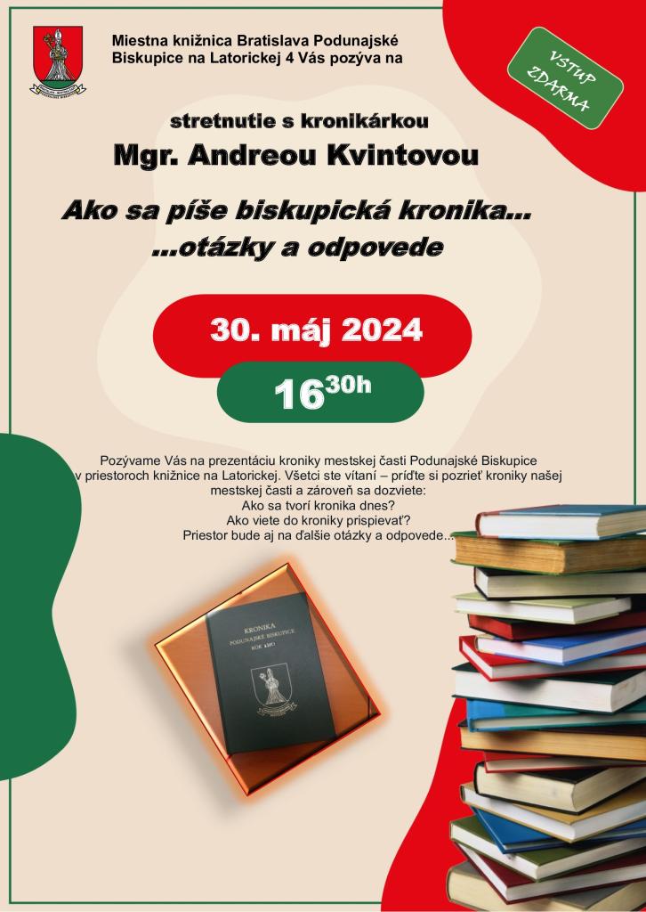 Pozývame vás na stretnutie s kronikárkou Mgr. Andreou Kvintovou a prezentáciu kroniky mestskej časti, ktorá sa dostala medzi najlepšie na Slovensku.