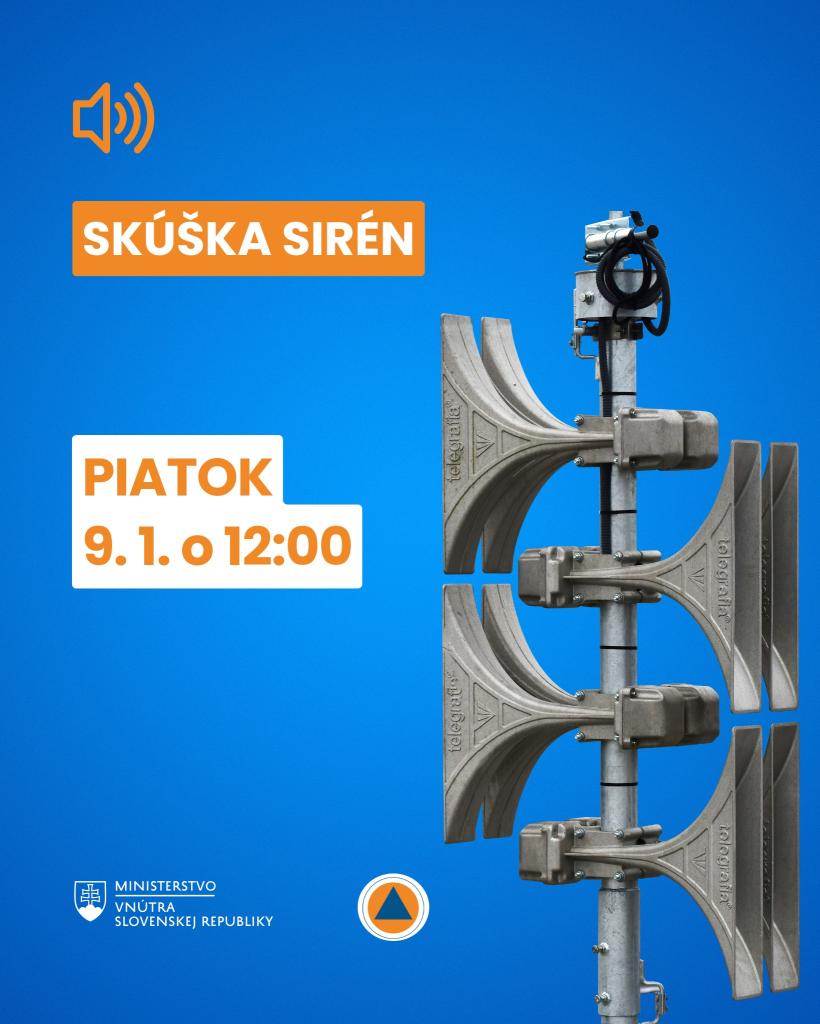 Dnes, v piatok 9. 1. 2026 o 12:00 h bude vykonané pravidelné preskúšanie varovnej siete elektromotorických sirén na území Slovenskej republiky dvojminútovým stálym tónom. Na zvyšných elektronických sirénach bude vykonaná tichá technická skúška.