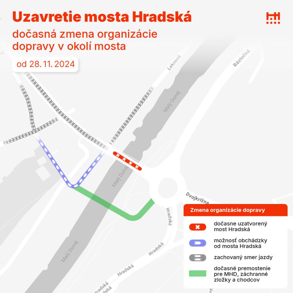 Most na Hradskej, postavený v roku 1962, už dlhšie nebol v dobrom stave a jeho komplexná modernizácia si bude vyžadovať úplné rozobratie celého mosta aj nosných pilierov. „Dočasnému uzatvoreniu mosta pre všetku dopravu sa preto, žiaľ, nebude možné vyhnúť. Spolu s uzatvorením mosta 28. novembra, spustíme zároveň v rovnakom čase do prevádzky dočasné premostenie len niekoľko desiatok metrov vedľa. Tento dočasný most však budú môcť využívať iba vozidlá MHD, záchranné zložky a chodci. Ostatné vozidlá budú musieť využiť iné trasy,“ upozorňuje magistrát.