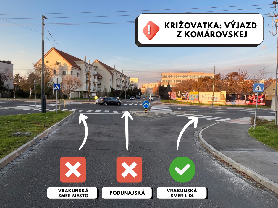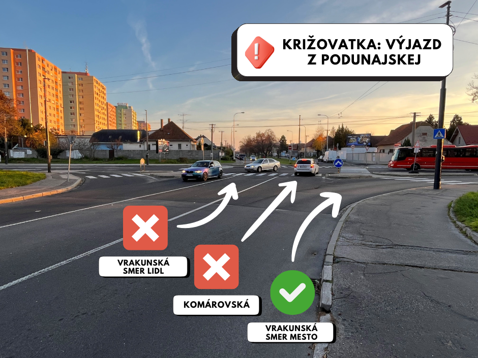 - Prejazd po Vrakunskej cez túto križovatku bude zachovaný – v oboch smeroch bude z nej možné odbočiť na Komárovskú aj Podunajskú.